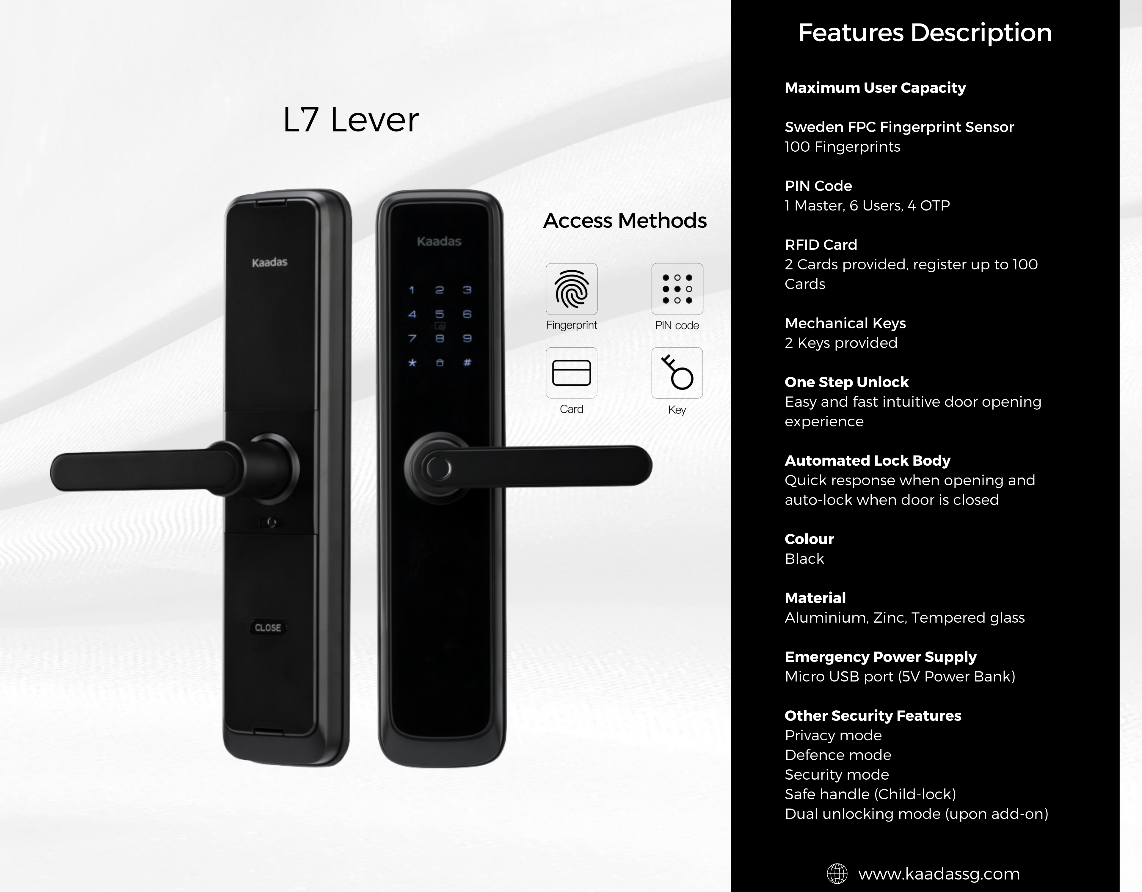 Kaadas L7 Digital Door Lock is one of the most sought after lever handle digital lock, with it's ergonomic placement of the fingerprint sensor, you can unlock your door with one smooth motion, a one step unlocking system.