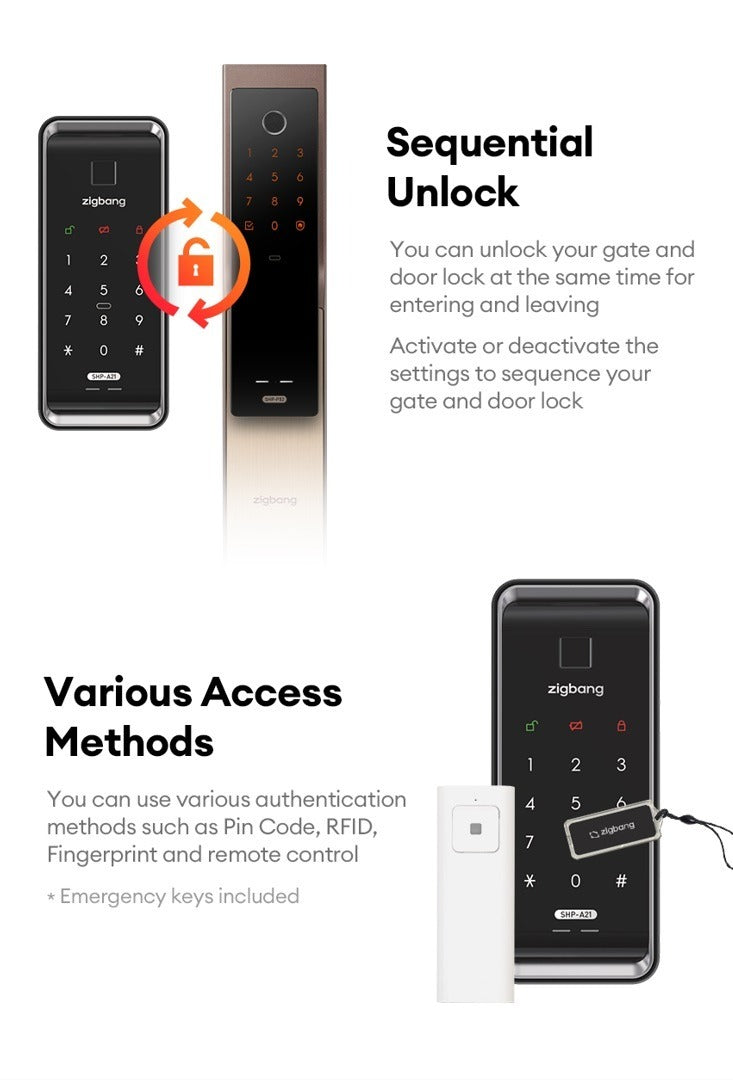 The Zigbang SHP-P52 is a sleek and advanced digital door lock offering enhanced security features such as fingerprint recognition, PIN code access, and smartphone connectivity. With a stylish design and user-friendly interface, it provides convenience and robust protection for modern homes.